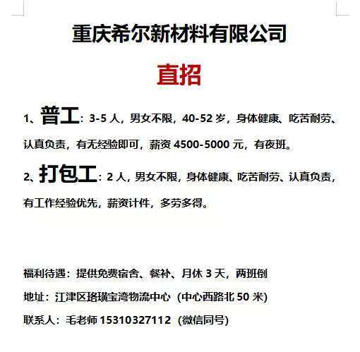 重庆希尔新材料有限公司直招 普工:3-5人,男女不限,40-52岁,身体健康,吃苦耐劳, ...